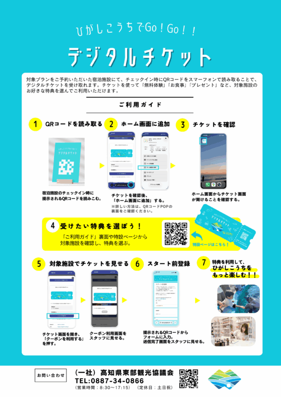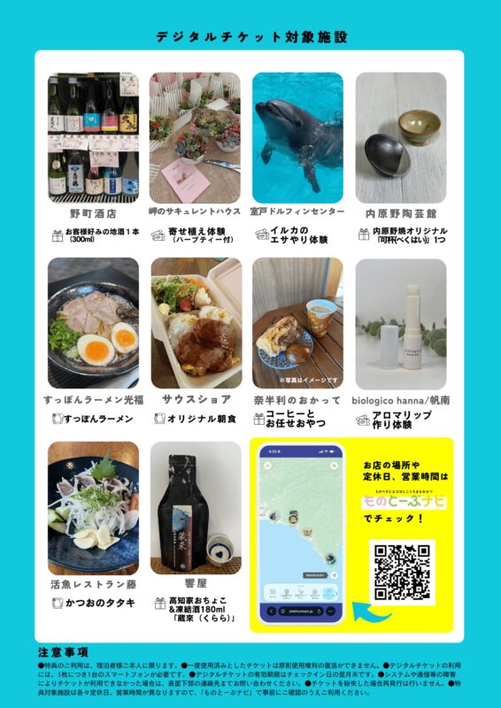 ひがしこうちエリアの対象宿泊プランを利用すると、エリア内の特典施設で使えるデジタルチケットをプレゼント♪